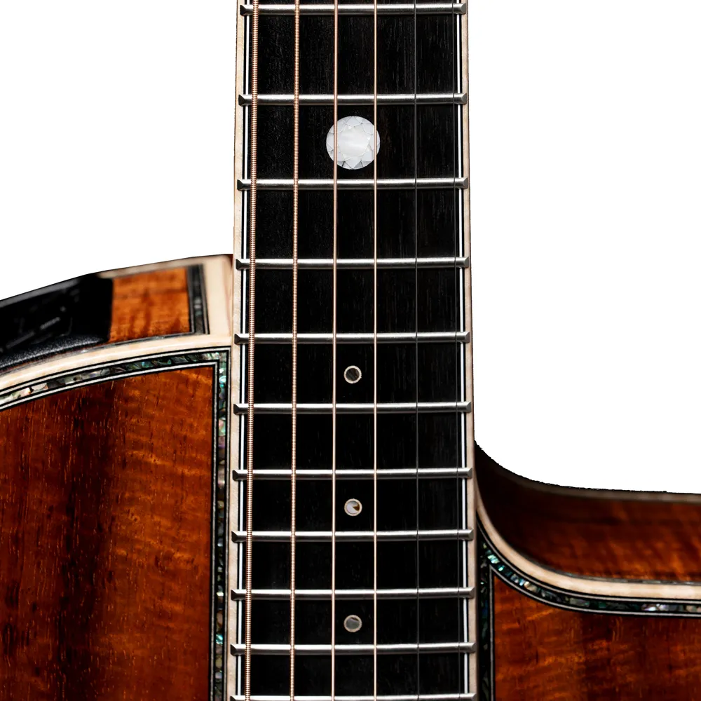 To celebrate THE 60TH anniversary of the diamond wedding, a diamond image position-marker sits on the 12th fret. This is precisely cut by laser cutting machine inspired by the design of the traditional diamond "excellent cut". These small facets of select acrylic materials of various reflective qualities are precisely cut by laser and carefully crafted by hand.