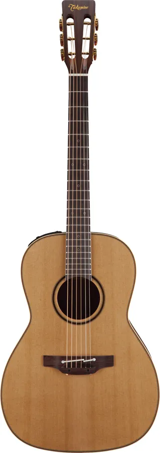 The solid cedar top features hand-scalloped X bracing and ivory binding, with dark purfling and a gorgeous concentric-ring rosette with wood marquetry. The unique Takamine split-saddle bone bridge provides faultless intonation and excellent acoustic coupling to the top.