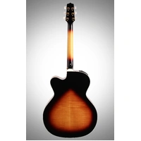 Takamines' P6JC jumbo cutaway model is loud and forceful, with a resonant solid spruce top with scalloped "X" top bracing for maximum volume, a solid flame maple back and flame maple sides, a convenient Venetian cutaway for easy access to the upper reaches of the fingerboard, and elegant body binding with black and white purfling and mother-of-pearl rosette.