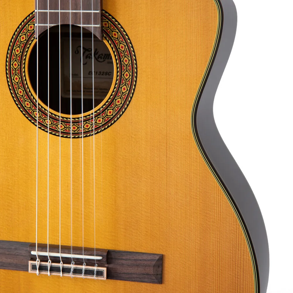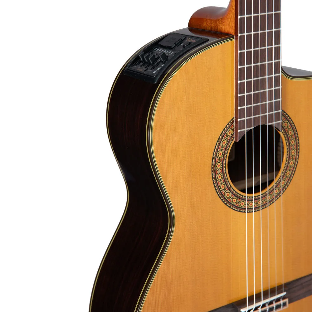 The solid cedar top produces a warm full tone with plenty of dynamic range. The solid rosewood back aids in the projection and enhances the sonic brilliance of the instruments. Gloss natural finish provides durability and adds to the beauty of the guitar. The mahogany neck features a dual action truss rod, which keeps the guitar playing perfectly in any environment. Includes Takamine's CT4B II preamp system and a Takamine case for safe transporting.
