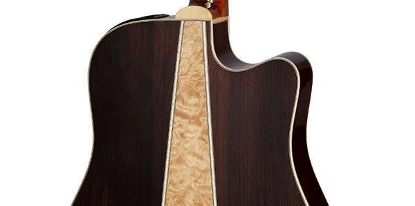 For players seeking stage worthy features and an uncommon look, the GD93CE features a solid spruce top, rosewood sides and a beautiful three piece rosewood & quilted maple back. The slim mahogany neck and 12" radius bound rosewood fingerboard provide great feel and playability, while the onboard Takamine TK40D preamp system gives you a built in tuner, three band EQ and gain controls, mid contour switch, notch filter and EQ bypass switch for the ultimate in versatility and sound quality.