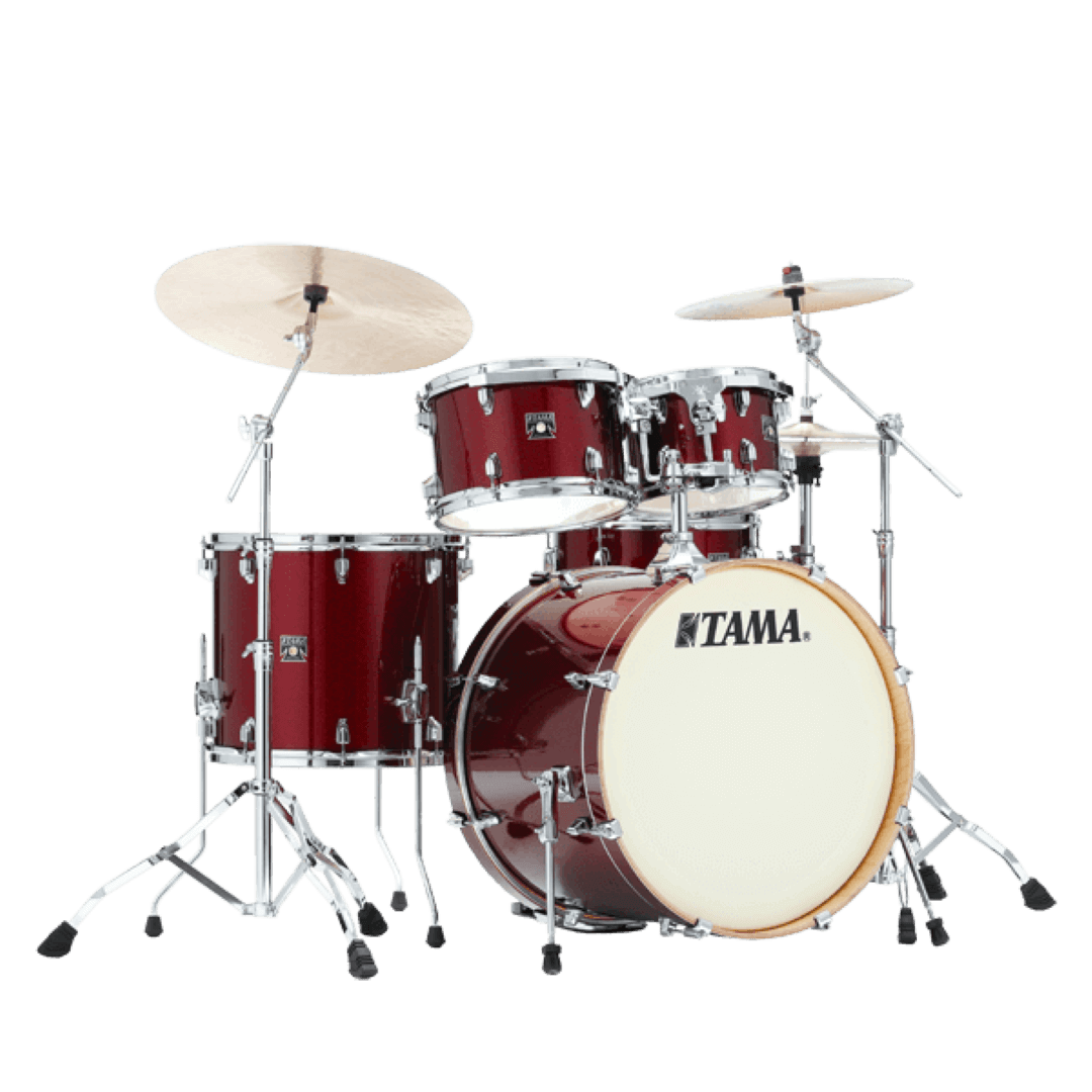 The Tama CK50RSDRP Superstar Classic Maple Kit, in Dark Red Sparkle, comes from a long line of kits with groundbreaking design, with amazing build quality, tone, and projection. This 5-piece kit features 100% Maple shells - 6 ply at 5mm on the toms and snare, and 8 ply at 7mm for the bass drum. Maple shells produce a full, powerful tone, with rich resonance. This resonance is enhanced by Tama's Star-Mount system, which provides support at four points along the batter side hoop of the toms. Tama has also developed low-mass lugs for the Superstar kits, reducing the surface area that the lugs occupy on the shell, which further enhances resonance. .