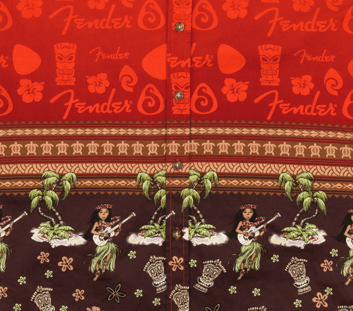 Fender® goes Hawaiian in this classic fit button up shirt. Featuring tiki, hula dancers, and Fender logos, this will be your go-to shirt all summer long.