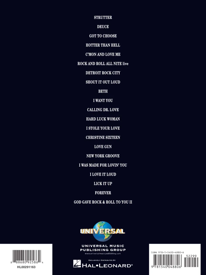 This matching folio features 21 of the most time-tested hits of this legendary heavy metal band in authentic transcriptions for guitar with notes and tab. Songs include: Beth • Calling Dr. Love • Christine Sixteen • C'mon and Love Me • Detroit Rock City • Deuce • Forever • God Gave Rock & Roll to You II • Got to Choose • Hard Luck Woman • Hotter Than Hell • I Love It Loud • I Stole Your Love • I Want You • I Was Made for Lovin' You • Lick It Up • Love Gun • New York Groove • Rock and Roll All Nite • Shout It Out Loud • Strutter.