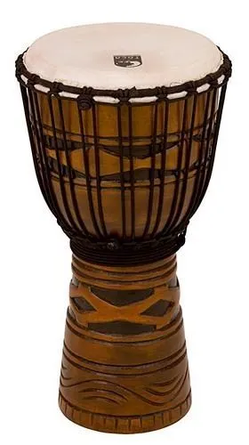 TODJ10AM Toca's Origins Series Wood Djembes are as traditional as a djembe can get. Beautifully hand carved from a single piece of plantation grown mahogany, they are drums to be cherished and enjoyed for years. The shell's interior is grooved to eliminate unwanted overtones, so the drum produces classic high pitch slaps, robust midtones and rich deep bass tones. Origins Series Djembes have rope tuned natural goatskin heads and come in different sizes to satisfy any player in search of a keepsake djembe. Our environmentality is to always think green. And you don?t get to be one of the world?s best djembes without keeping the world in mind. That’s why our djembes use only certified, plantation grown wood that?s treated and dried in buildings powered by solar technology.
