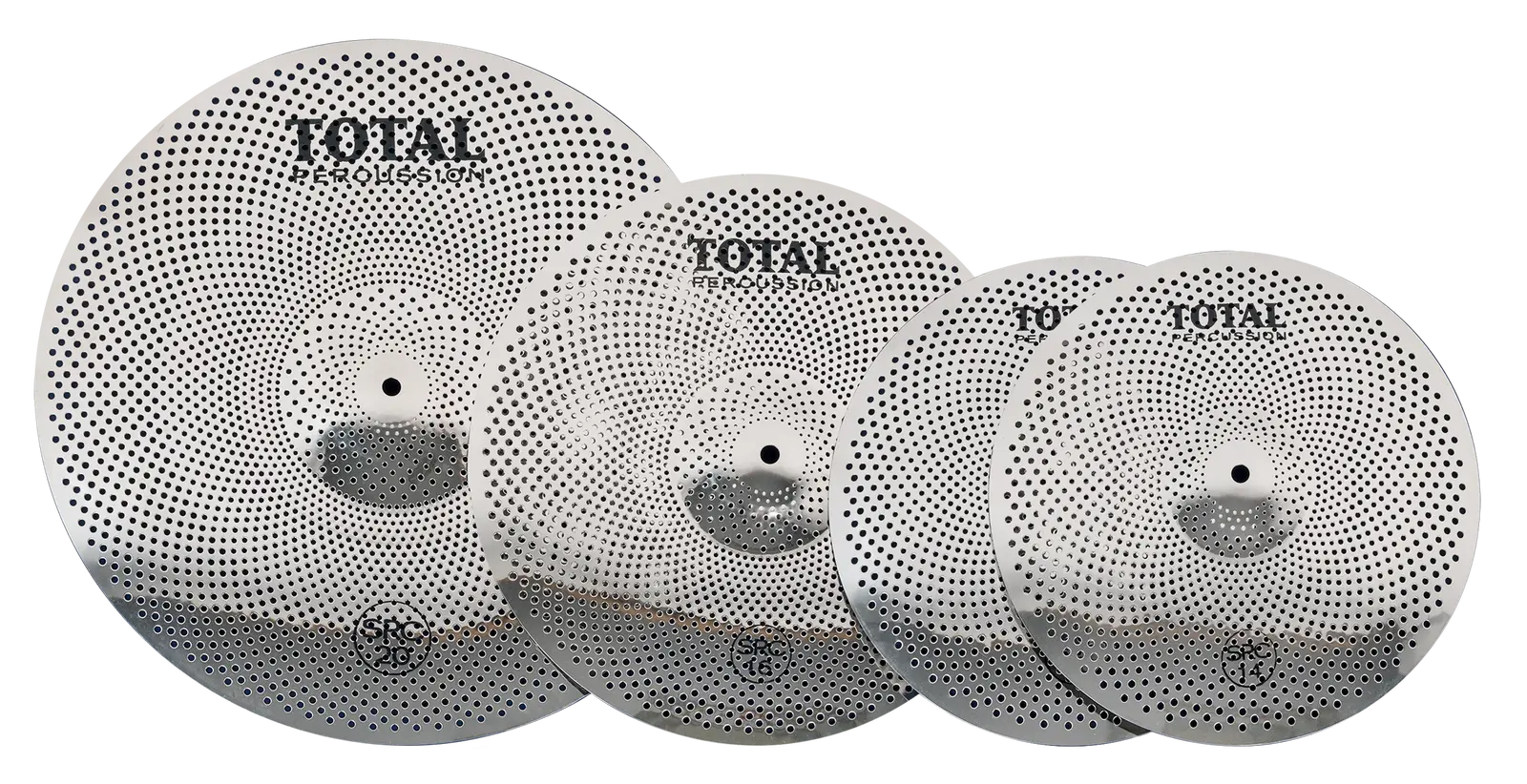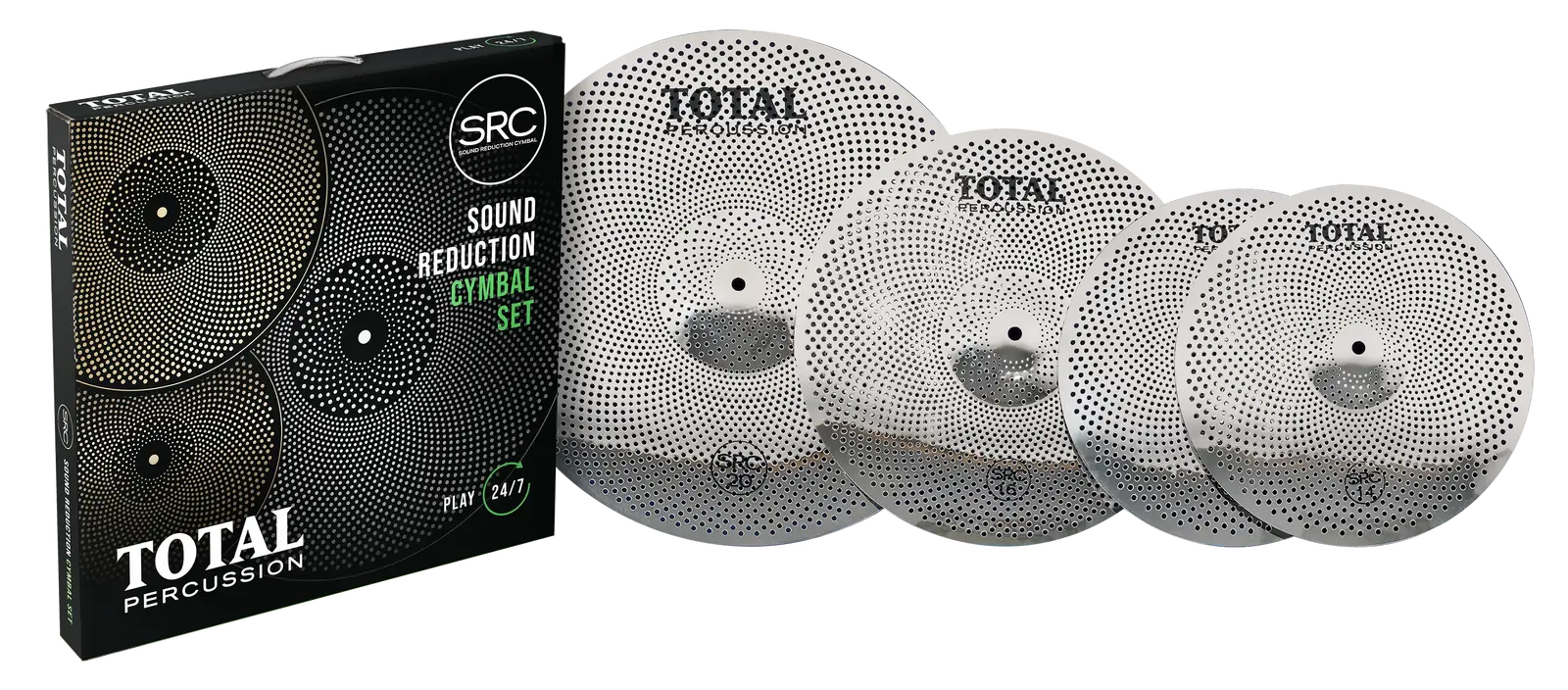 Total Percussion's Sound Reduction Cymbals allow you to play or practice at any time of the day without annoying the neighbours. Utilising proprietary Stainless Steel alloy, these cymbals are specifically designed to reduce volume for 24/7 practice, but not enough to lose the tones and pitches of different sized cymbals in your set. These cymbals offer a reduced sound playing level, great for smaller acoustic gigs,  and can also be mic’d through a PA. SRC Cymbals work perfectly in conjunction with sound reduced mesh drumheads or mute pads for low volume practice on your acoustic kit.