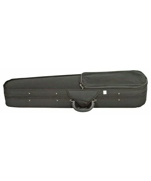 V-CASE - 3/4 violin case. Moulded polystyrene. Shaped. Covered with black nylon waterproof yarn. Grey plush lined. 2 bow holders and internal accessory compartment. Full length zipper. External accessory pocket. 2 shoulder straps attached.