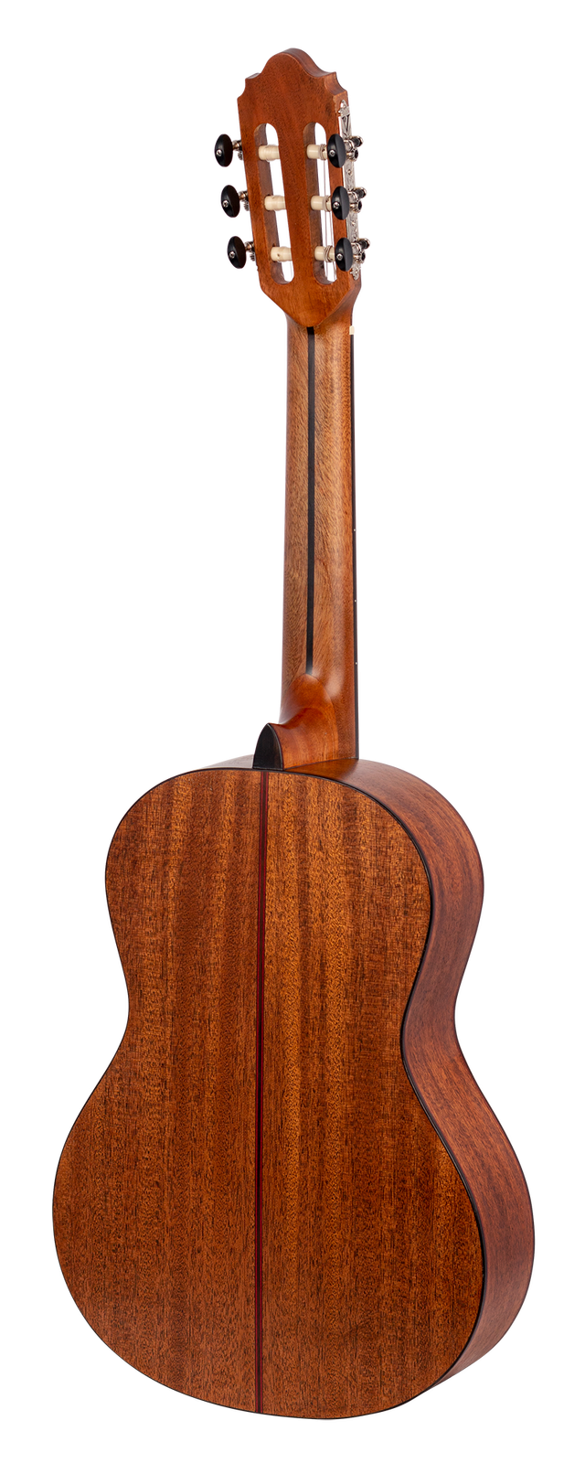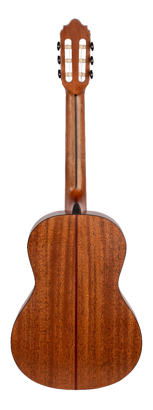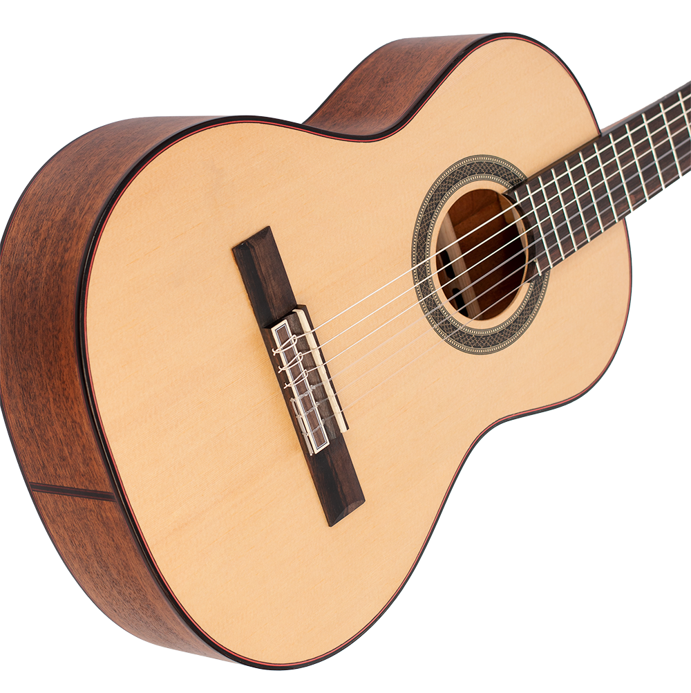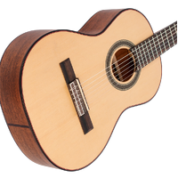 The Solid Sitka Spruce Top, with innovative ToneFlow bracing, gives this guitar an outstanding range that responds to your lightest touch with articulation and detail. Premium Mahogany back and sides enhance low-mid richness. A premium Mahogany neck and Amara Ebony fingerboard deliver exquisite playability. Other features such as exotic wood veneers, inlaid natural wood mosaic rosette and custom decorated machine heads result in a classical guitar that exceeds expectations in looks, tone and feel.