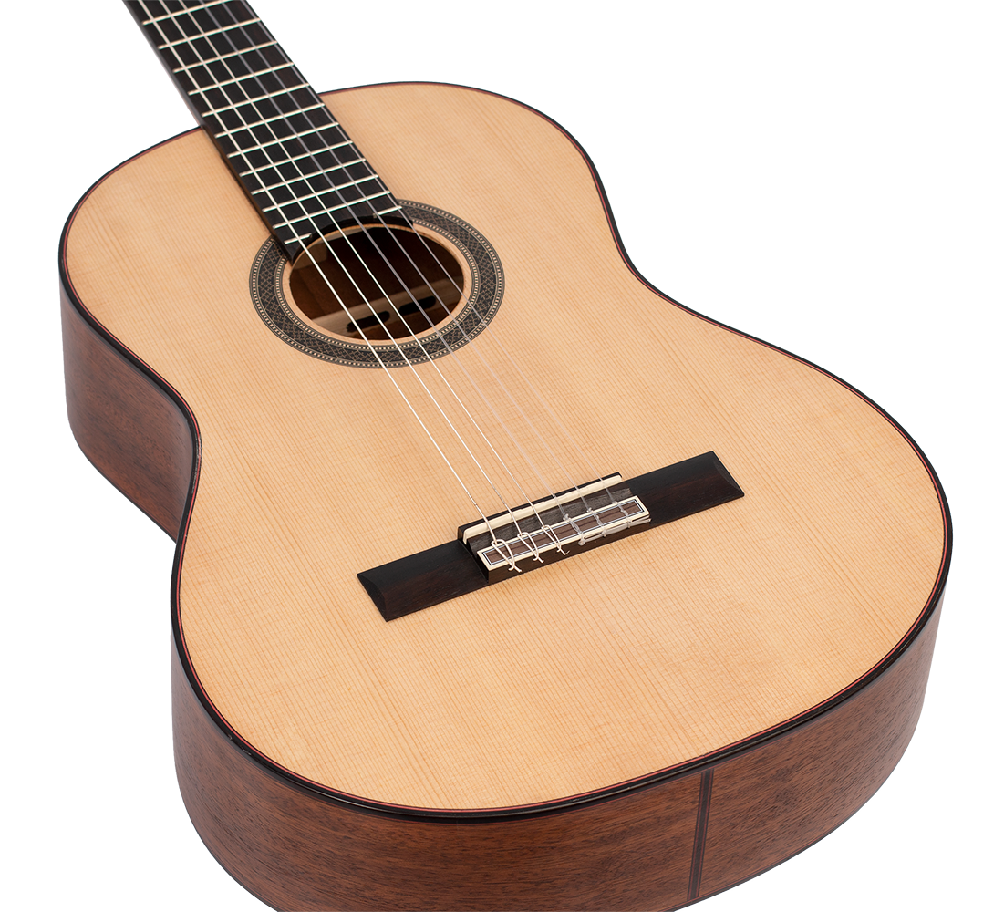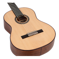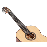 The Solid Sitka Spruce Top, with innovative ToneFlow bracing, gives this guitar an outstanding range that responds to your lightest touch with articulation and detail. Premium Mahogany back and sides enhance low-mid richness. A premium Mahogany neck and Amara Ebony fingerboard deliver exquisite playability. Other features such as exotic wood veneers, inlaid natural wood mosaic rosette and custom decorated machine heads result in a classical guitar that exceeds expectations in looks, tone and feel.