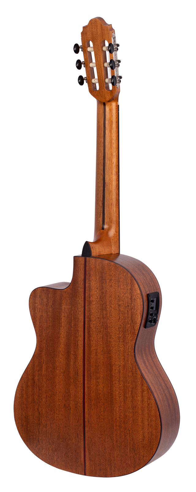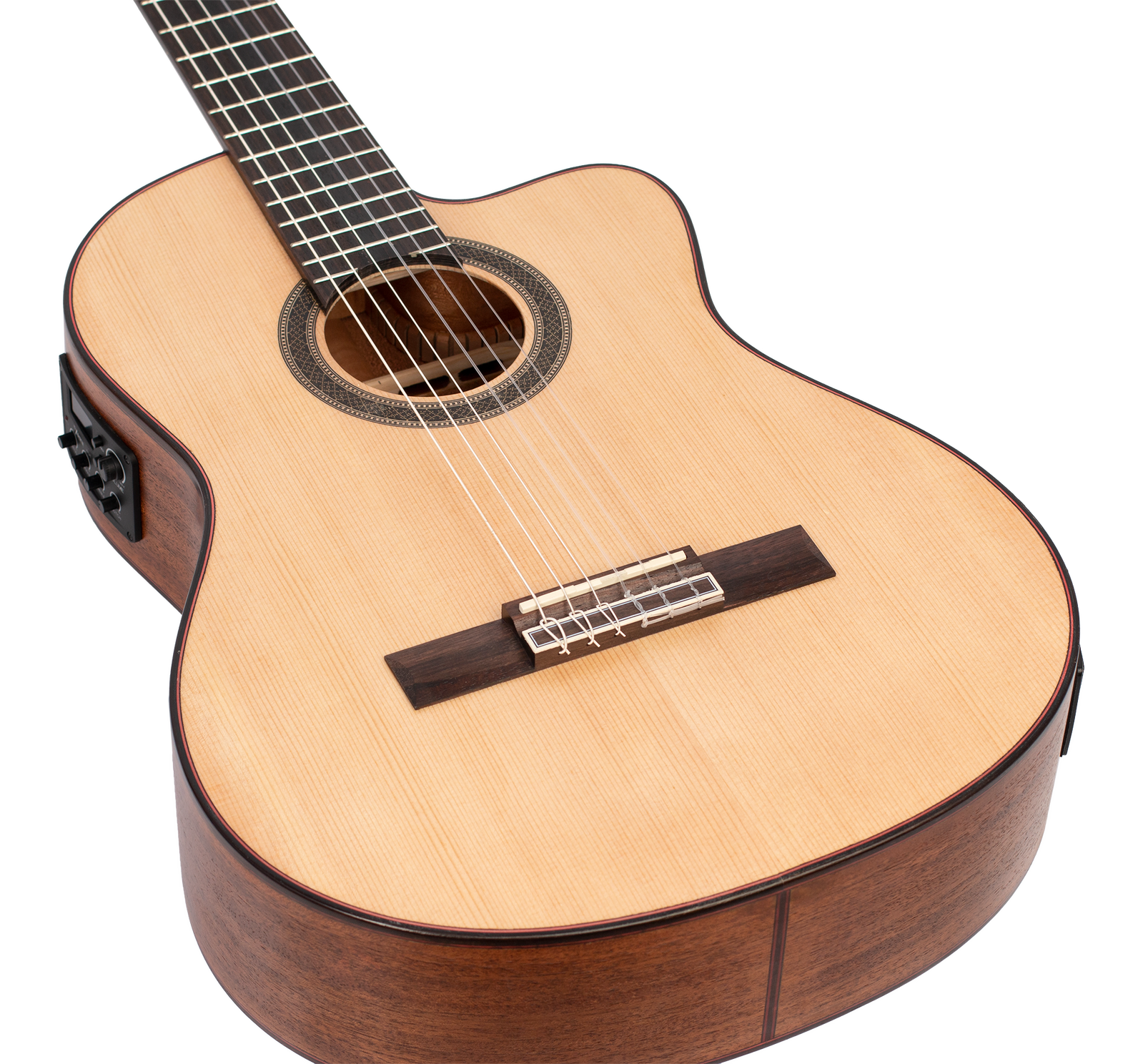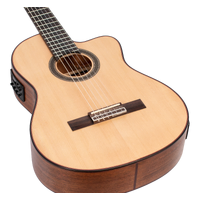 The Solid Sitka Spruce Top, with innovative ToneFlow bracing, gives this guitar an outstanding range that responds to your lightest touch with articulation and detail. Premium Mahogany back and sides enhance low-mid richness. A premium Mahogany neck and Amara Ebony fingerboard deliver exquisite playability. Other features such as exotic wood veneers, inlaid natural wood mosaic rosette and custom decorated machine heads result in a classical guitar that exceeds expectations in looks, tone and feel.