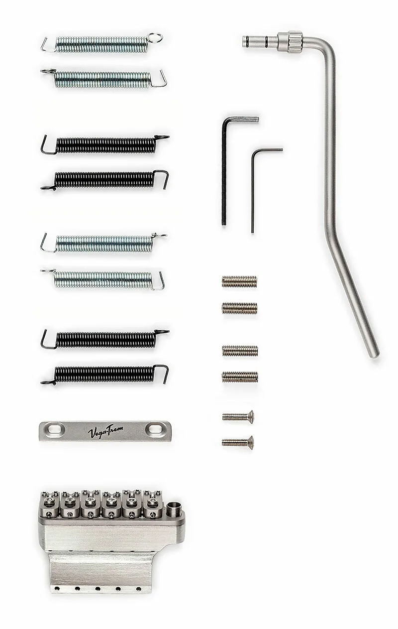 For guitars that are fitted with vibrato 2-point system. Finished in high quality stainless steel. The pack includes springs, adaptors and screws for the fulcrum and 1.5 mm (1/16 “) and 2.5 mm (3/32”) allen keys.