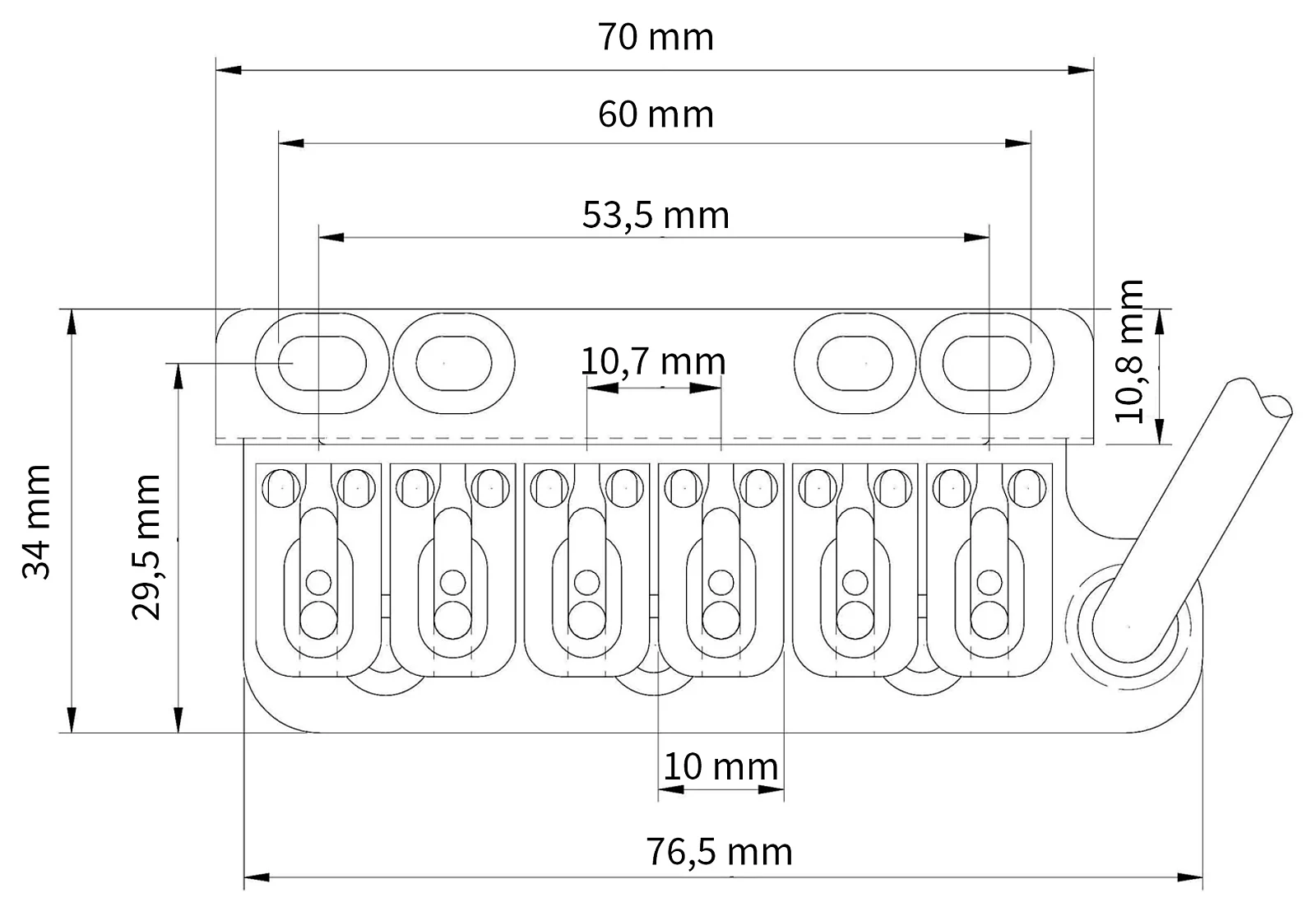 The patented VT system (ES 1119430 U) is based on two basic principles: the adaptation of the bridge dimensions to the existing standard cavity in the ST models and the bridge pivoting system. Adapting the dimensions aims to allow the bridge to freely enter into the cavity of the guitar body by pulling the whammy bar back (tensioning the strings) and requires a redesign of the complete assembly (saddles, plate and block). To optimize the movement of the bridge, the pivotal center of action has been changed by adding a part (fulcrum) that replaced the traditional concept of support on screws, giving more amplitude to that movement. The shape of the point of support of the plate on the fulcrum has also been changed, minimizing friction, which is practically non-existent. The result is a homogeneous action very pleasing to the musical performance totally free of unwanted noises. (It is recommended to use low friction nuts and locking tuners).
