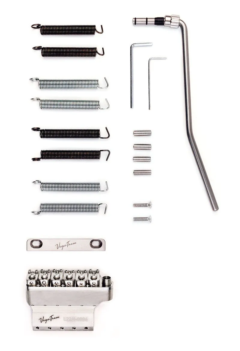 For guitars that are fitted with vibrato 2-point system. Finished in high quality stainless steel. The pack includes springs, adaptors and screws for the fulcrum and 1.5 mm (1/16 “) and 2.5 mm (3/32”) allen keys.