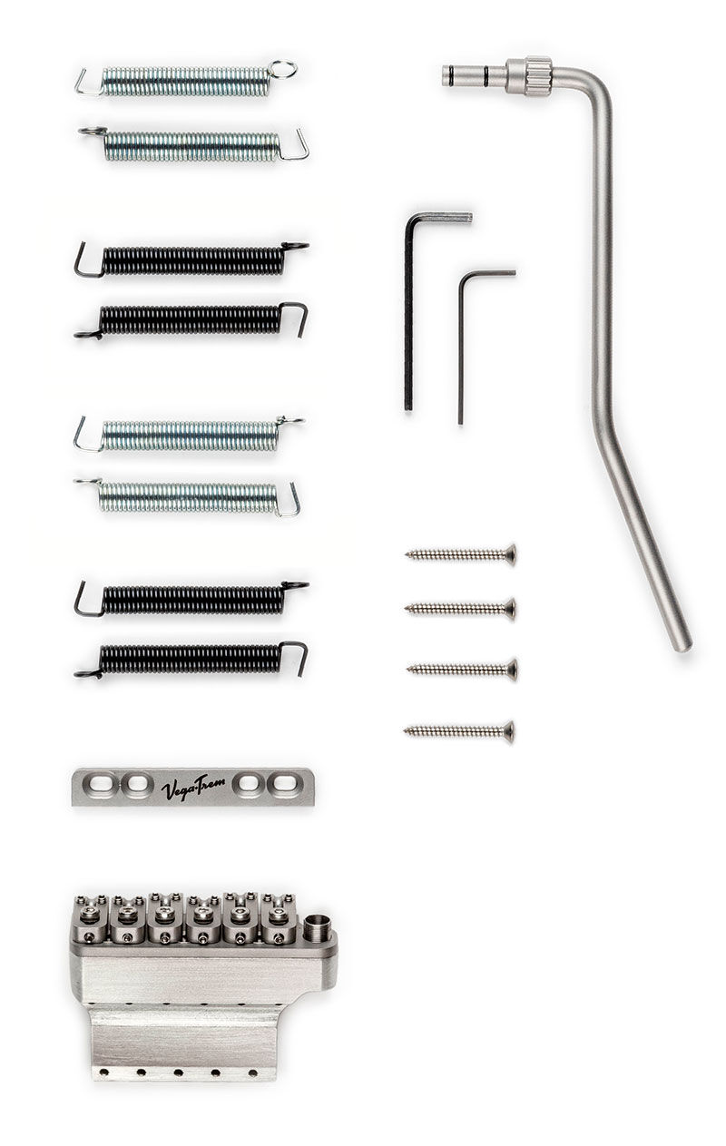For guitars that are fitted with vibrato with the traditional six screw system. Finished in high quality stainless steel. The pack includes springs, adaptors and screws for the fulcrum and 1.5 mm (1/16 “) and 2.5 mm (3/32”) allen keys.