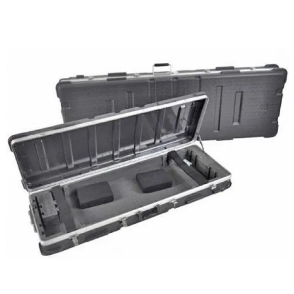 ABS keyboard case with wheels. Suits 61 keys. Moulded shells with aluminium interlocking edges and heavy duty pair of wheels. 4 butterfly catches and heavy duty hinges for extra road strength. Fixed and movable interlocking foam inner blocks with pads to suit various sized keyboards. Velcro safety straps for extra protection when you’re opening the case. 106 x 36 x 14.5cm.