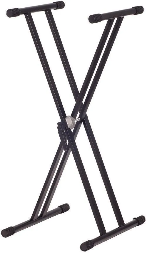 Black professional heavy duty 'X' style stand Double Braced. Multi height position flat to 97cms with interlocking lever system. High load capactiy support for electric pianos, organs or synths.