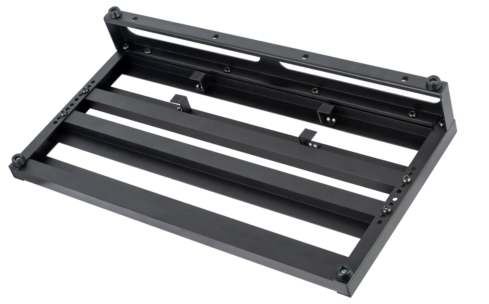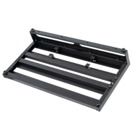 4 crossrail design with gradual incline. 2 adjustable middle rails. Includes power supply mounting brackets on the underside with 2 elastic bands to hold in place. Allen key included. Lightweight aluminium construction. Crossrails fitted with loop grip tape. Self-adhesive hook tape included to fit your effect units. Non-slip rubber feet. Heavy duty padded nylon gig bag with accessory pocket and shoulder strap. Dimensions: 56cm (W) x 28.5cm (D) x 3-10cm (H)