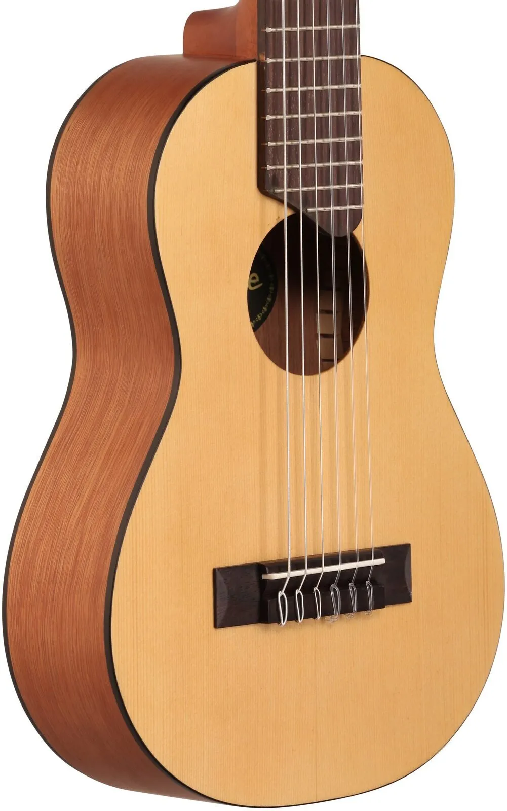 This is a 433mm scale ukulele-style nylon string guitar. It's fun and stylish at any time, any where. Guitalele is a perfect take-along guitar.The guitalele’s tuning is pitched up to “A” (or up a 4th) at A/D/G/C/E/A.